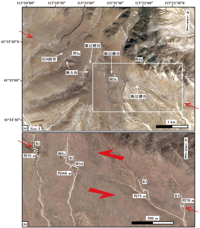 Displaced geomorphic features along the fault trace at Site 5. (a)ArcGIS satellite image showing linear fault troughs, uphill-facing scarps, offset stream channels, and beheaded stream channels at Site 5; (b)Google Earth satellite image showing the systematically left-lateral offset stream channels along the fault trace