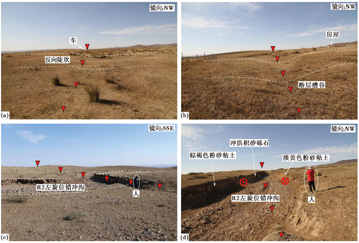 Field photos showing the displaced geomorphic features along the fault trace at Site 5(red triangles indicate the fault locations).(a~b)Field photos showing the uphill-facing scarps and fault-parallel valley; (c)Field photo showing the R2 left-lateral offset stream channel; (d)Field photo showing the sedimentary characteristics of the exposed sediments on the walls of R2 stream channel. See locations of photos in Fig. 4